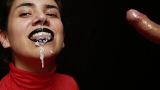 CFNM - Red turtleneck, Black lips - Hj + Jism mouthful + Cum on clothes