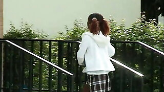 Super-hot teenager black chick gets it on with white dude outdoors