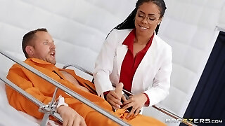 Horny and hot black doctor displays her tits before patient pokes her mish
