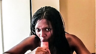 Black hottie sucks and deepthroats a sausage and feels proud of herself