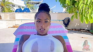Chubby ebony Victoria Cakes drops her bikini to rail a white jizz-shotgun